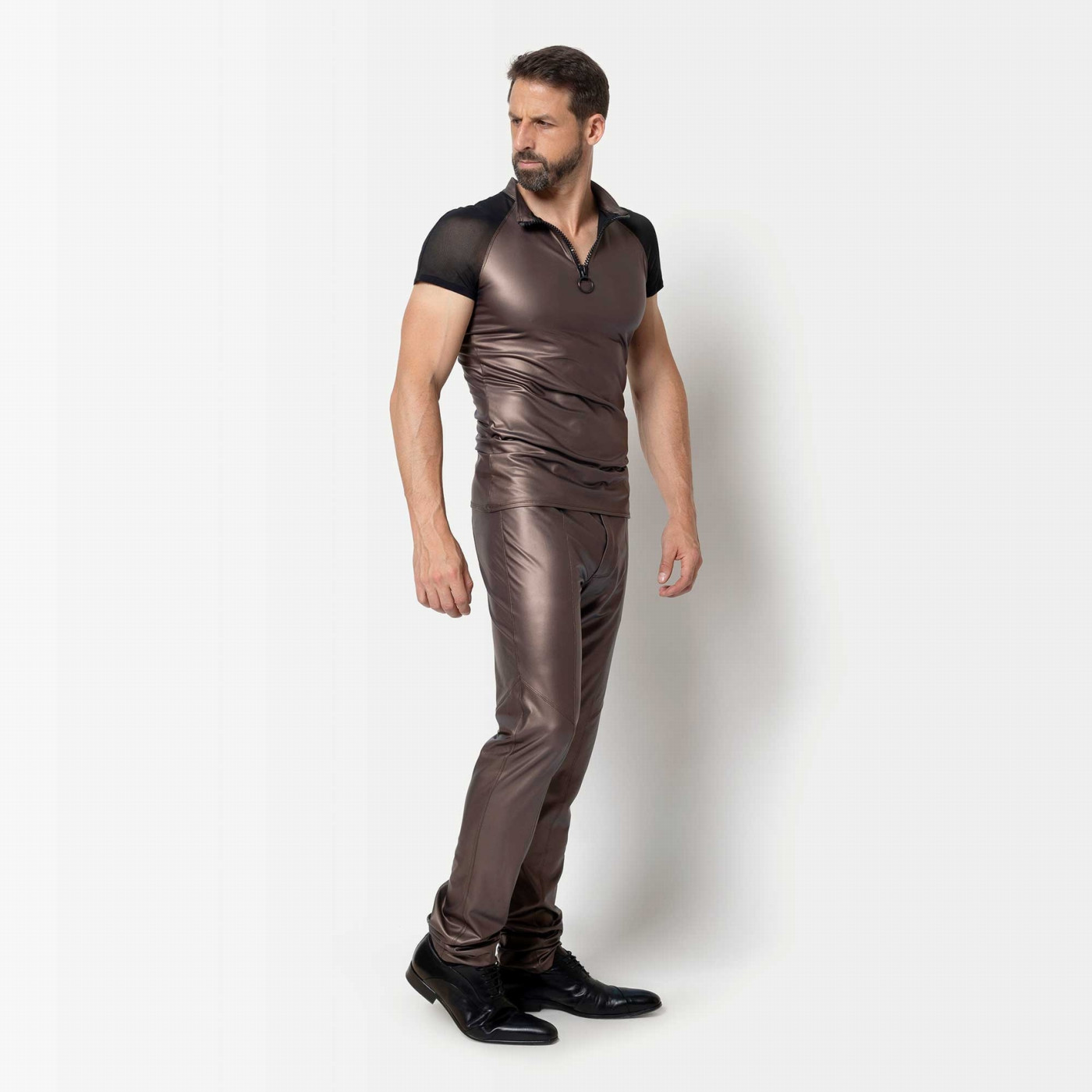 Het Ketil shirt is een shirt gemaakt van bruin wetlook met een zijdeglans. Het heeft een opstaand kraagje met een stoere rits. De mouwtjes zijn van gaas. Dit shirt past o.a. heel goed bij de bijpassende Ketil broek.