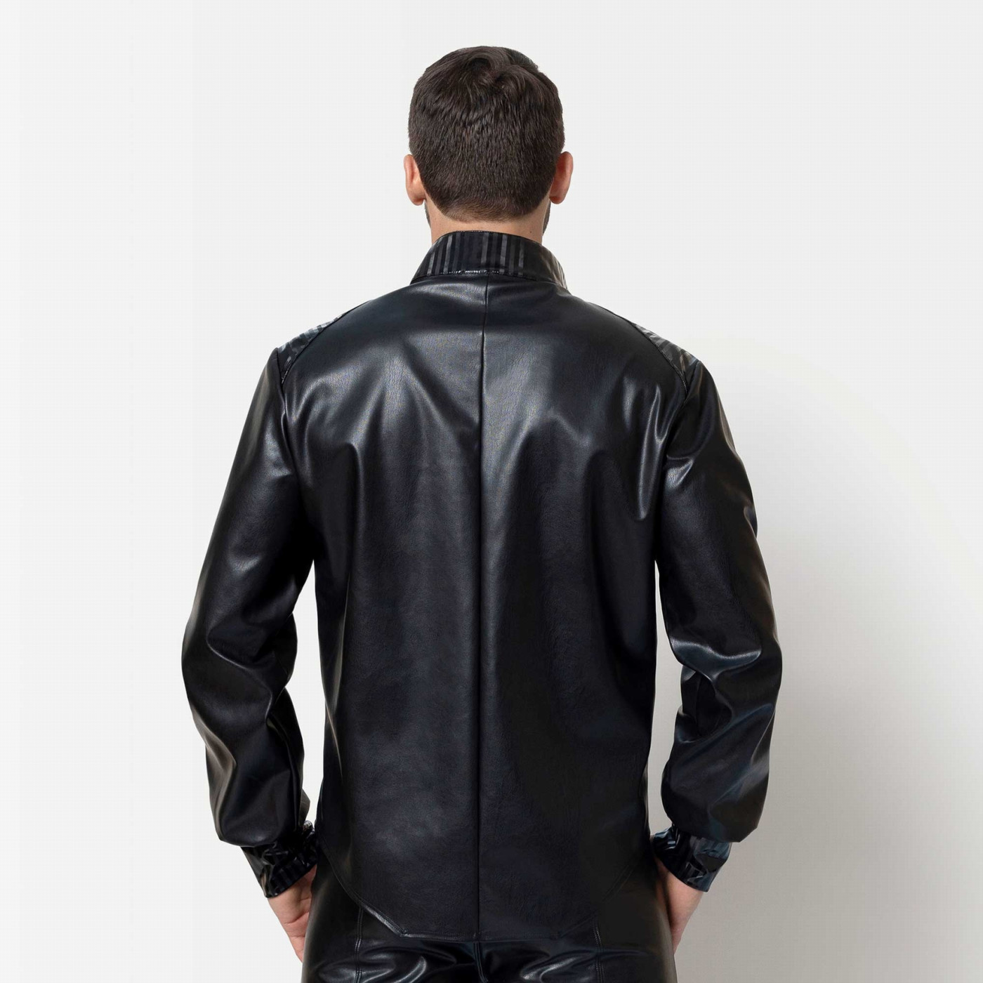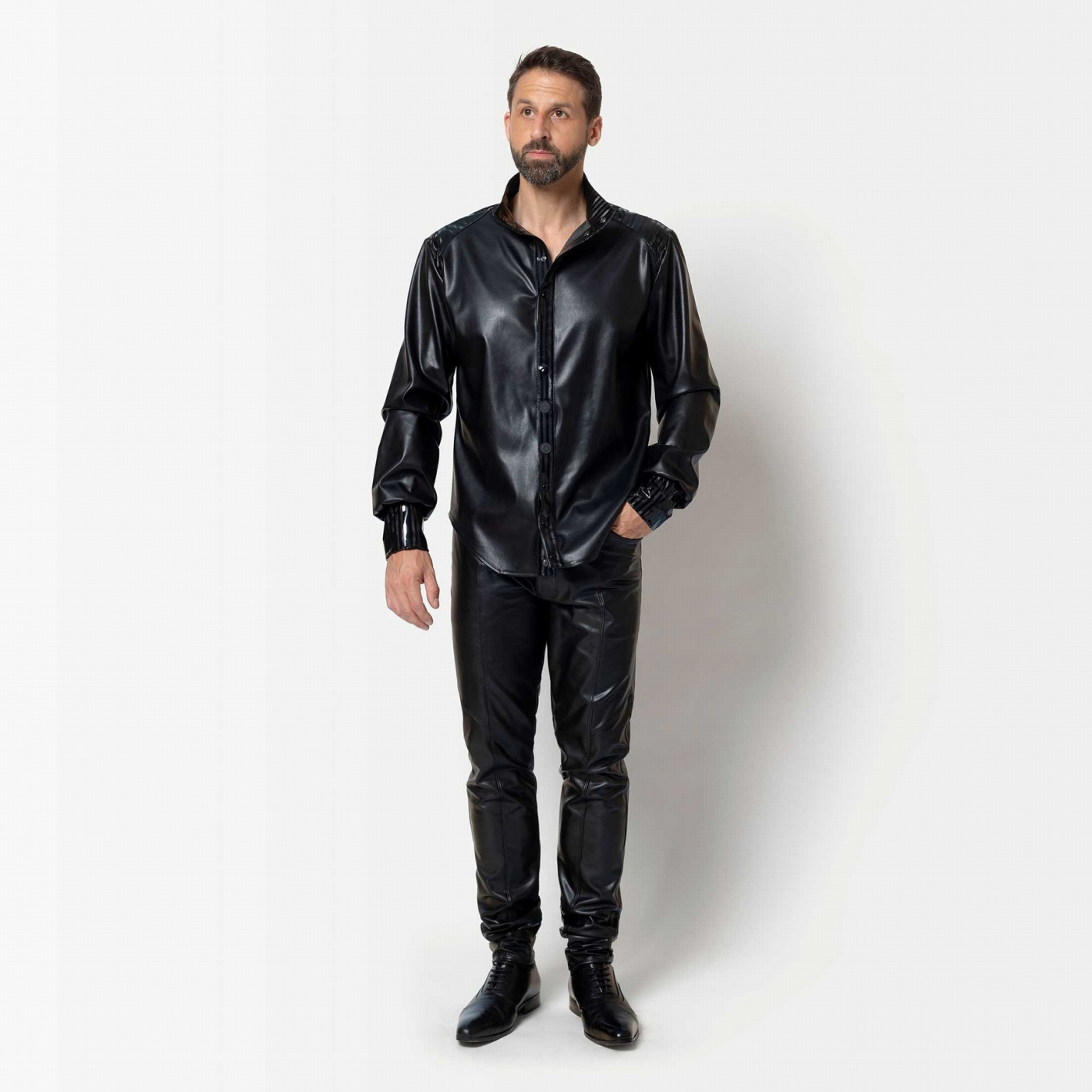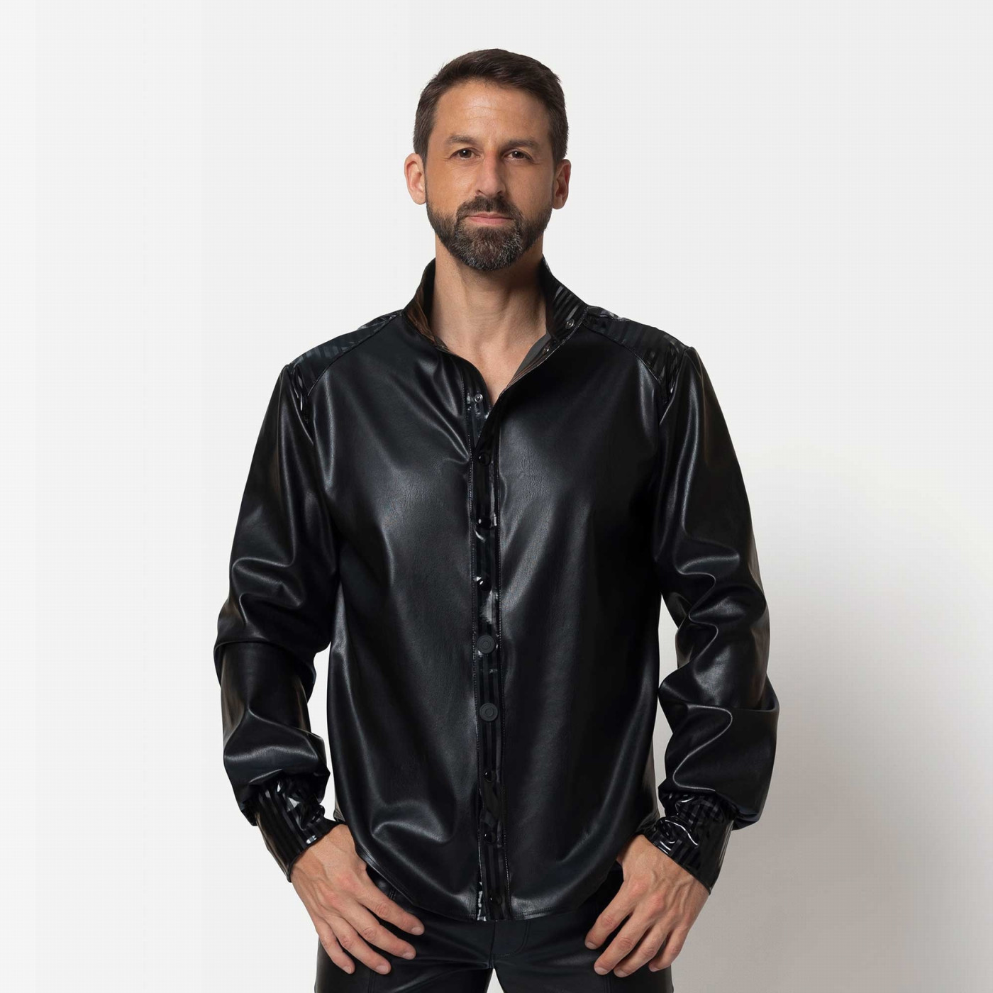 Dit shirt met opstaand kraagje is gemaakt van zacht kunstleer met hier en daar inzetten van gestreept lak. Dit is echt haute couture in de fetish kleding. Alles aan deze blouse klopt en zelfs de knopen zijn opvallend: glimmende zwarte drukkers met matte grotere drukknopen.