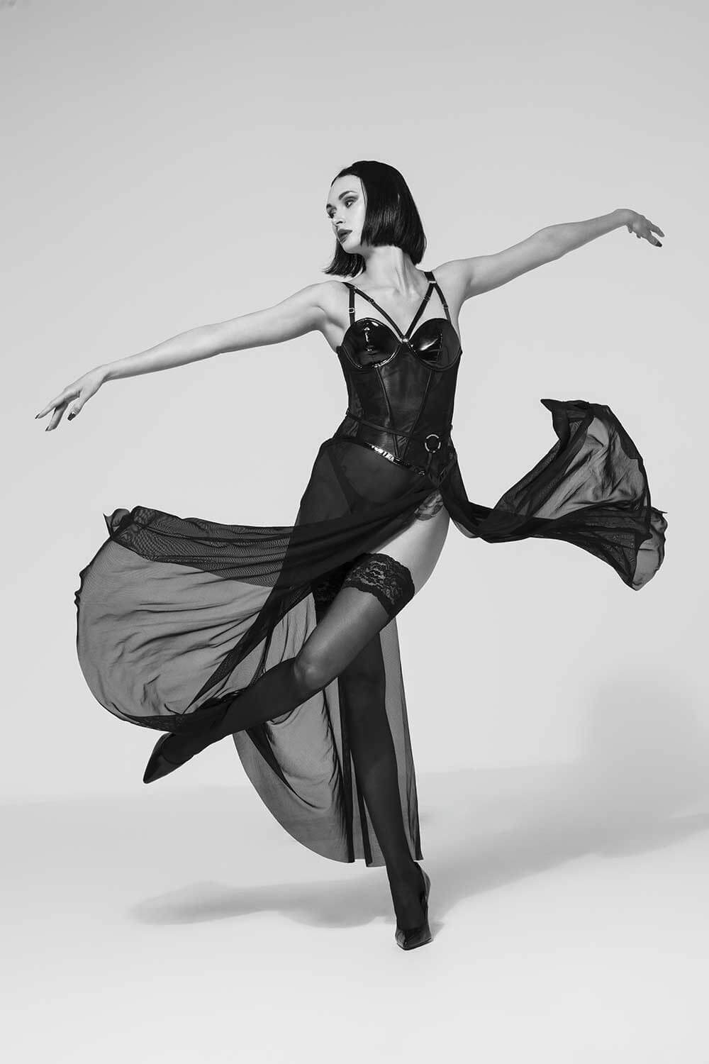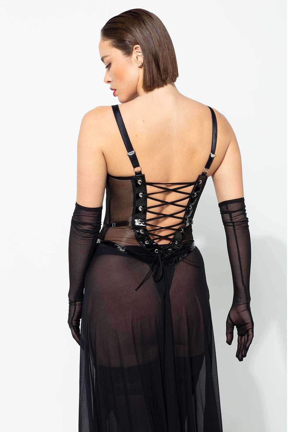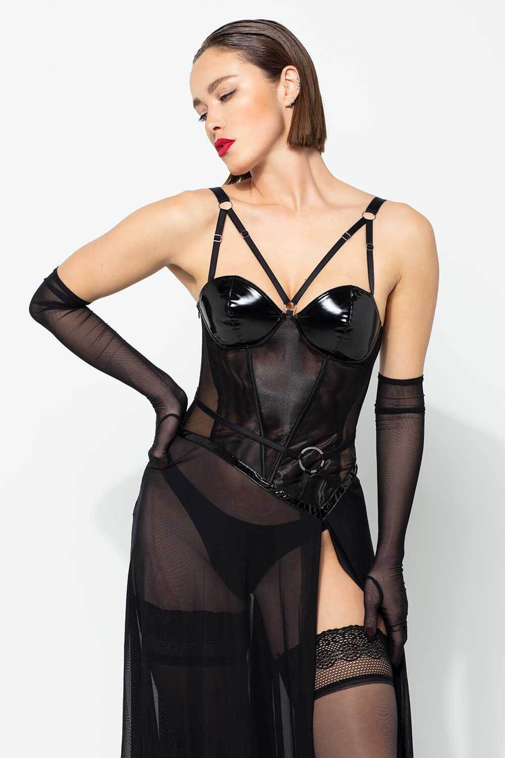 Jij wordt een echte blikvanger met deze jurk met opvallende lakaccenten en de lak cups. Het doorzichtige korset lijfje heeft een rits aan de zijkant en veters op de rug zodat het supermooi blijft zitten.