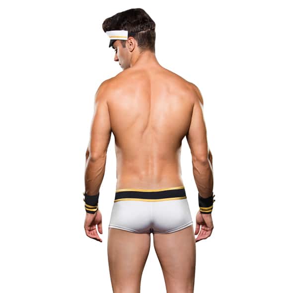 Alle hens aan dek! Deze witte boxer is speels geaccentueerd met vier gouden knopen en een gouden met navy rand. De bijpassende manchetten en zeemanshoed maken deze sexy driedelige set compleet. Iedereen houdt van een man in uniform!