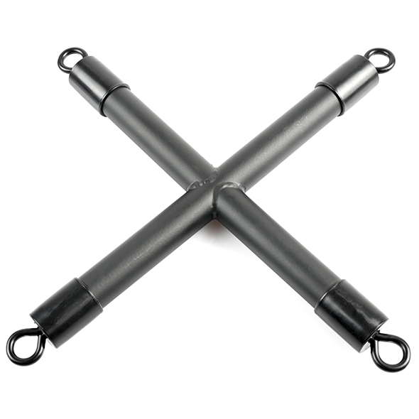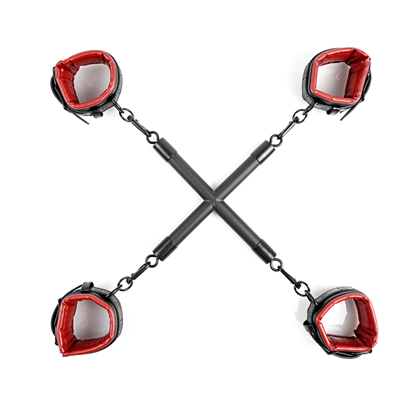 De hogtie is een sterk kruis met stevige O-ringen aan elk uiteinde om de vier gewatteerde en verstelbare boeien van kunstleer hieraan vast te zetten. De boeien kunnen ook aan elkaar worden geklikt of aan andere bondage objecten.