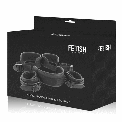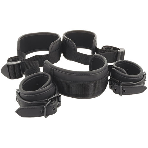 De set bevat; 2 verstelbare banden van nek tot been, 2 beenbanden, 2 handboeien en 1 steun voor de nek.
