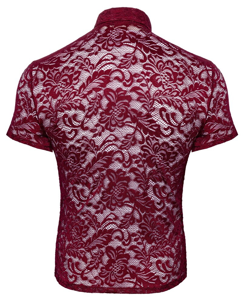 Met dit transparante overhemd van florale kant laat je meteen zien dat je lef én stijl hebt. Het donkerrode shirt met korte mouwen is gemaakt van zachte, elastische kant en sluit naadloos aan op het lichaam. Dankzij de klassieke kraag en knoopsluiting krijgt het een chique uitstraling, terwijl de see-through stof zorgt voor pure verleiding.