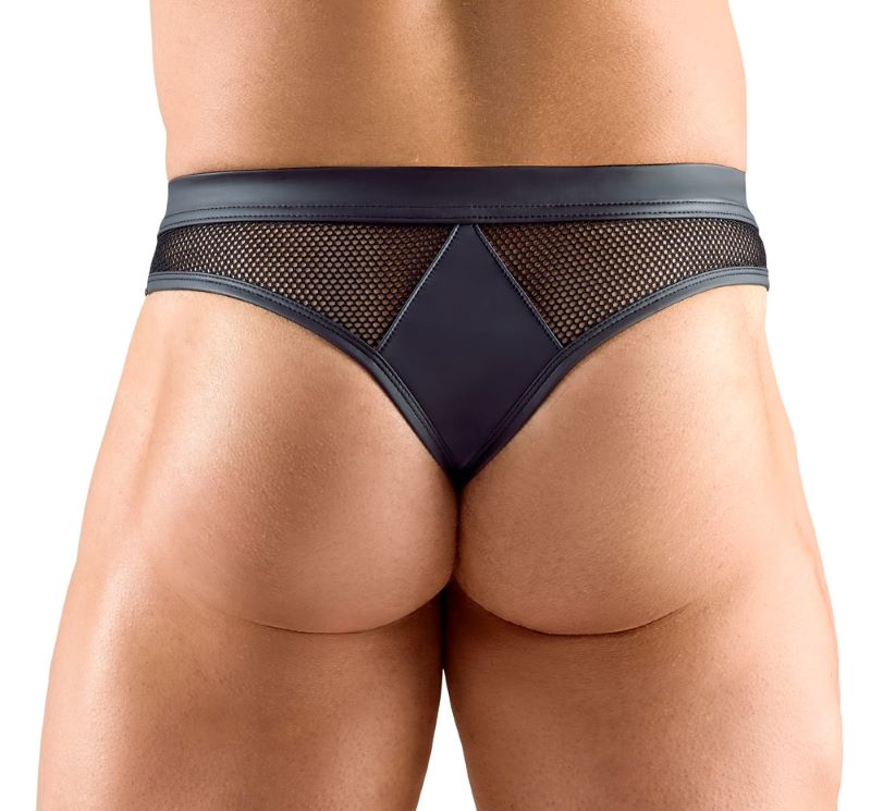 Sexy string in stoere neopreen look. Deze Svenjoyment string is gemaakt van een mix van rekbaar mat wetlook en spannende netstof. De gulp heeft glimmende drukknopen als sluiting.