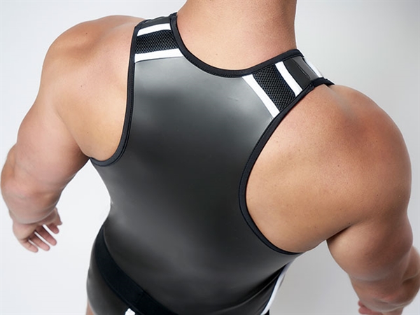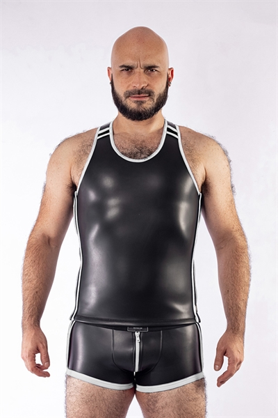 Deze tanktop heeft witte banen aan de zijkant en op de schouders. Dit reflecteert in het donker!
