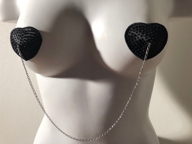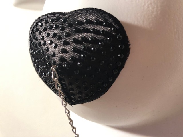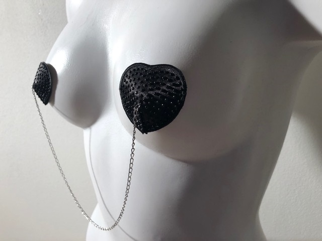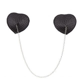 Sexy hartvormige tepelplakkers met een metalen ketting. De tepelplakker is bedekt met kleine zwarte steentjes.