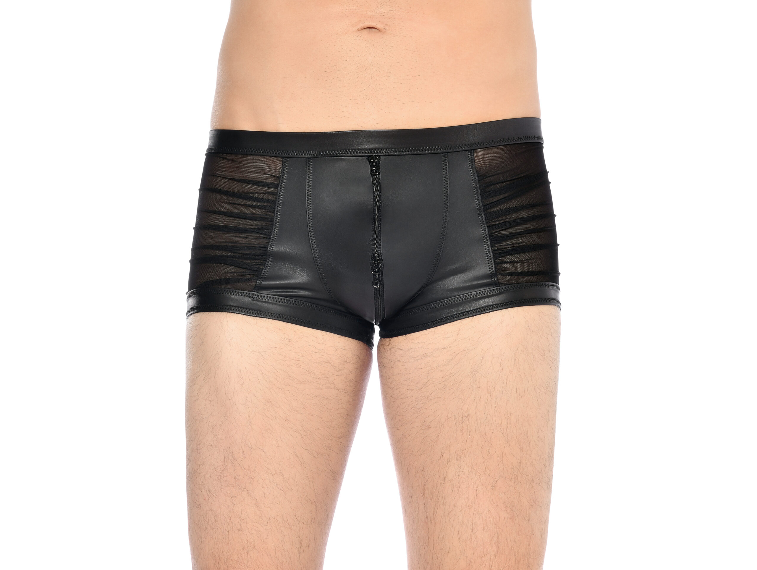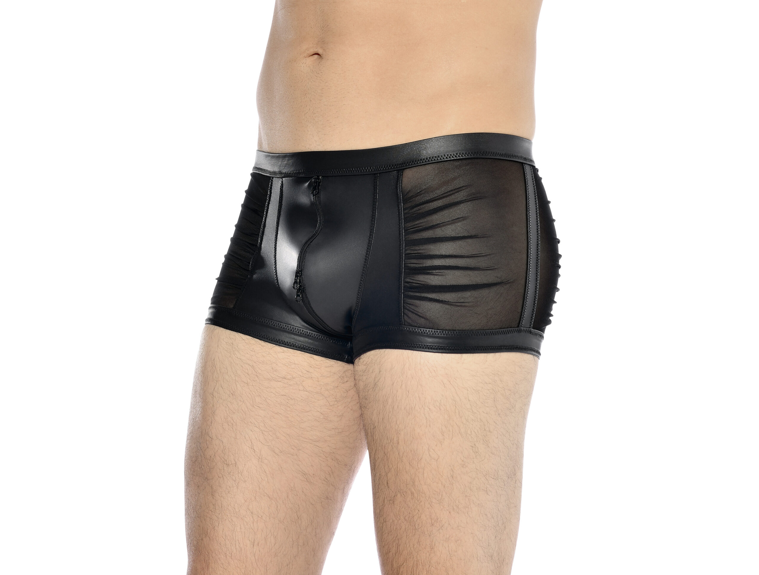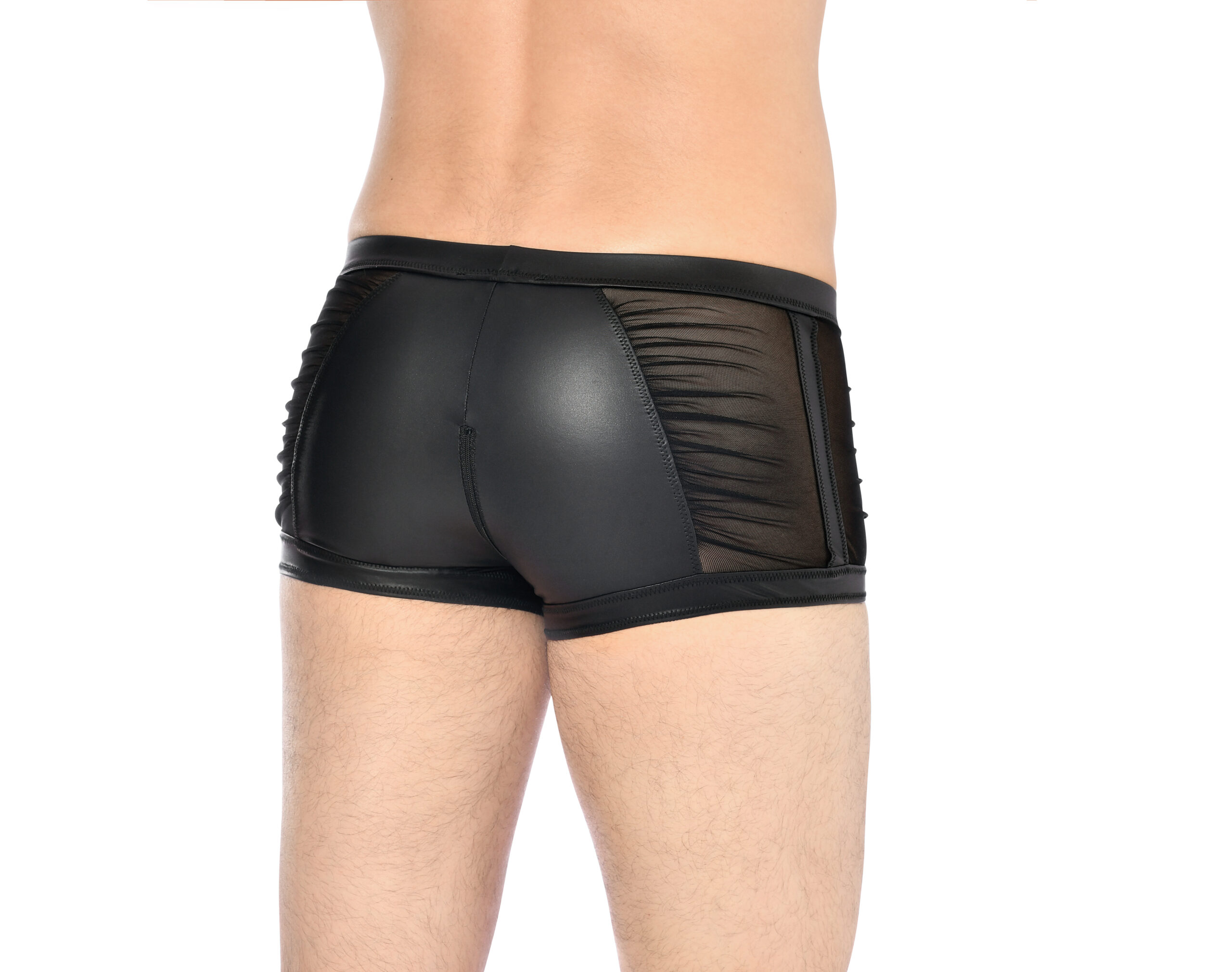 De unieke boxer Theon van de Franse ontwerper Patrice Catanzaro uit de Homme 5 collectie is echt een aandachtstrekker. Spannend door de speelse combinatie van wetlook en gerimpeld gaas. De voor en achterkant zijn van wetlook. De zijkanten op de heupen zijn van gaas met in het midden een smalle baan met wetlook.
