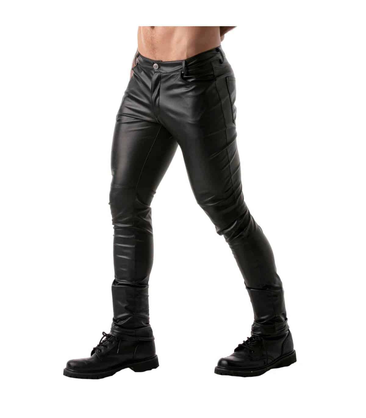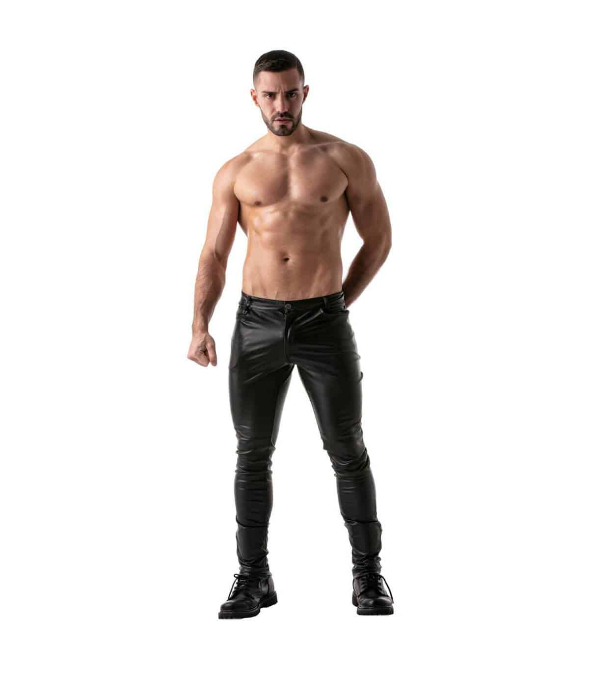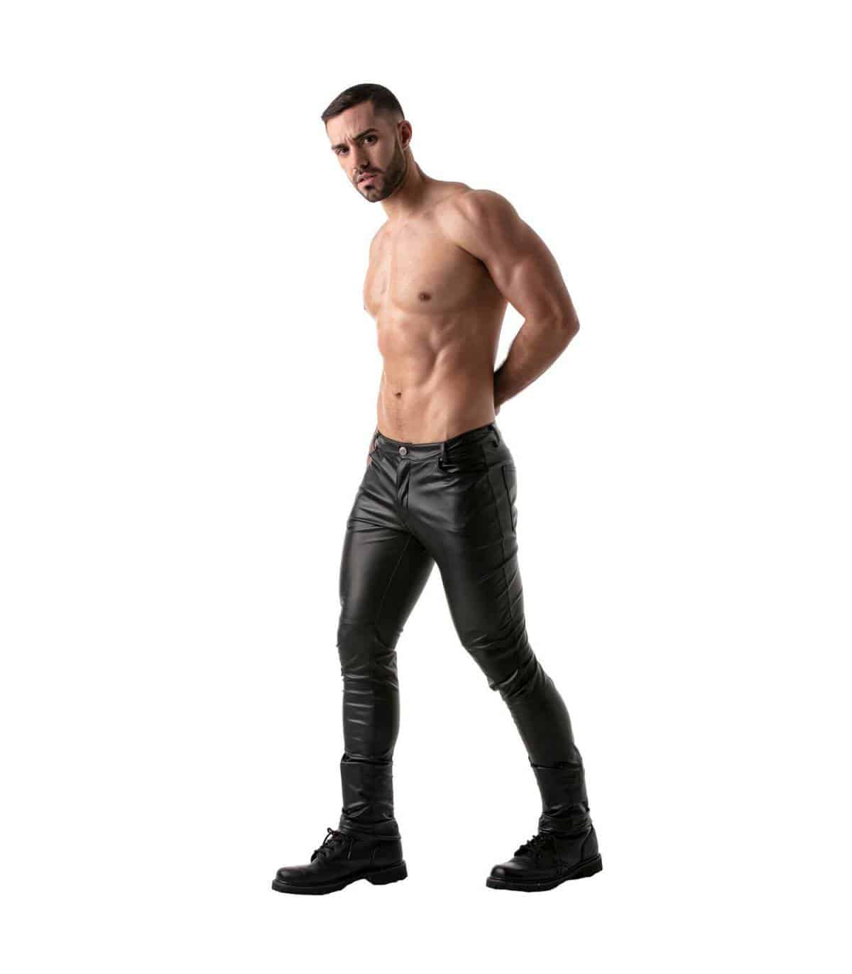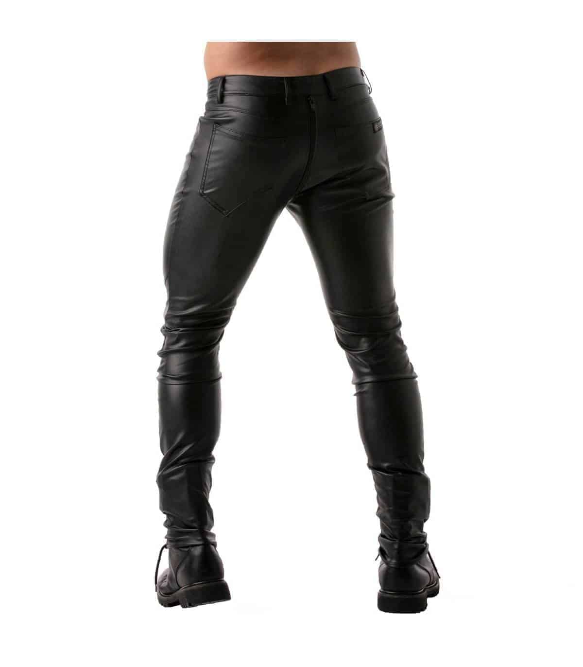 Lange broek van imitatieleer met volledige ritssluiting. De YKK-rits heeft een dubbele schuifregelaar, van het kruis tot de bovenkant van de verhoogde achterste tailleband. De broek kan dus volledig worden geopend van voor naar achter en vice versa. Maar natuurlijk kan deze stoere 5-pocket broek ook zo gedragen worden met en zonder shirt of borstharnas. De ingenaaide stukken bij de knieen geven deze broek een hele stoere look.