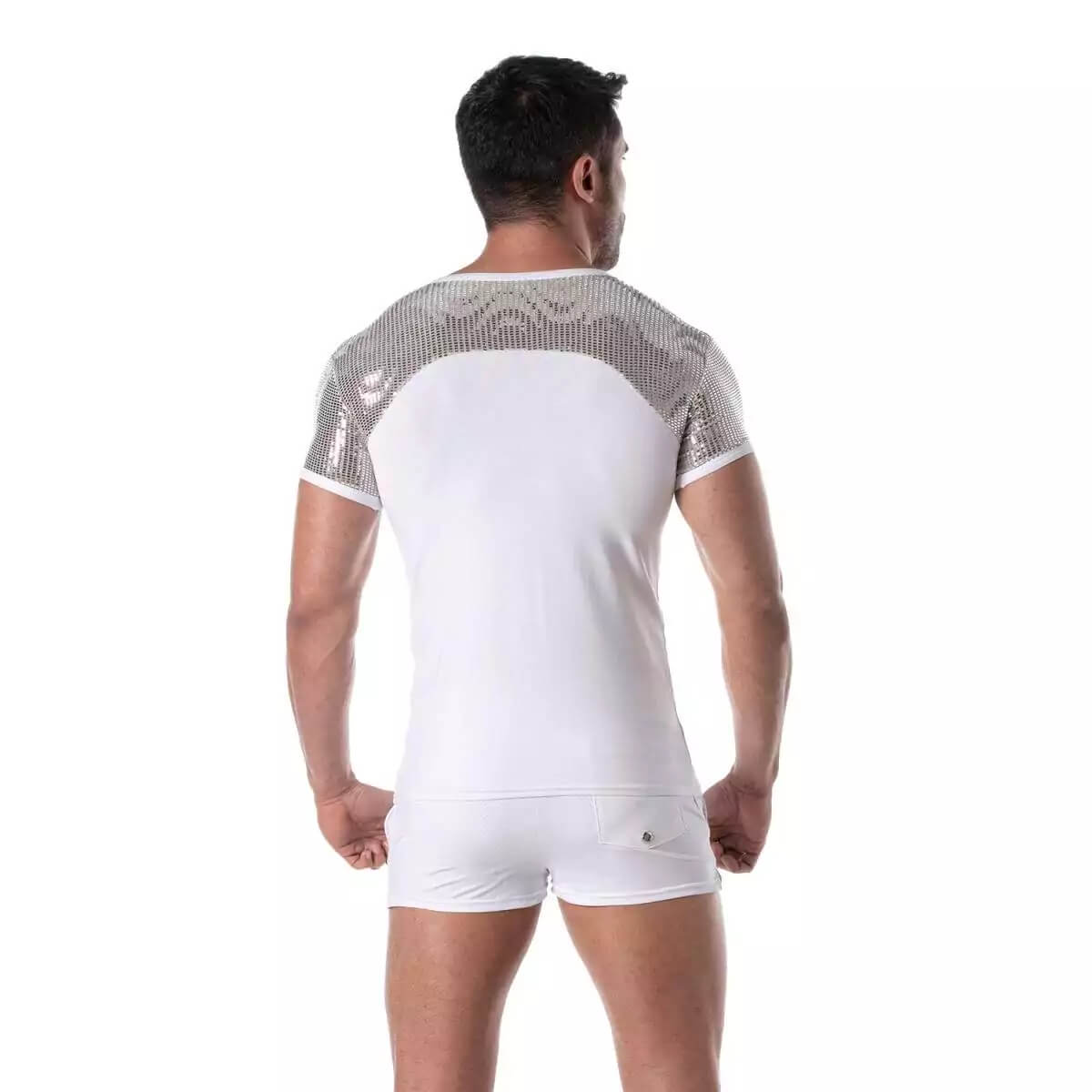 Dit shirt heeft een strakke snit met een schouderpartij die glinstert als een discobal!