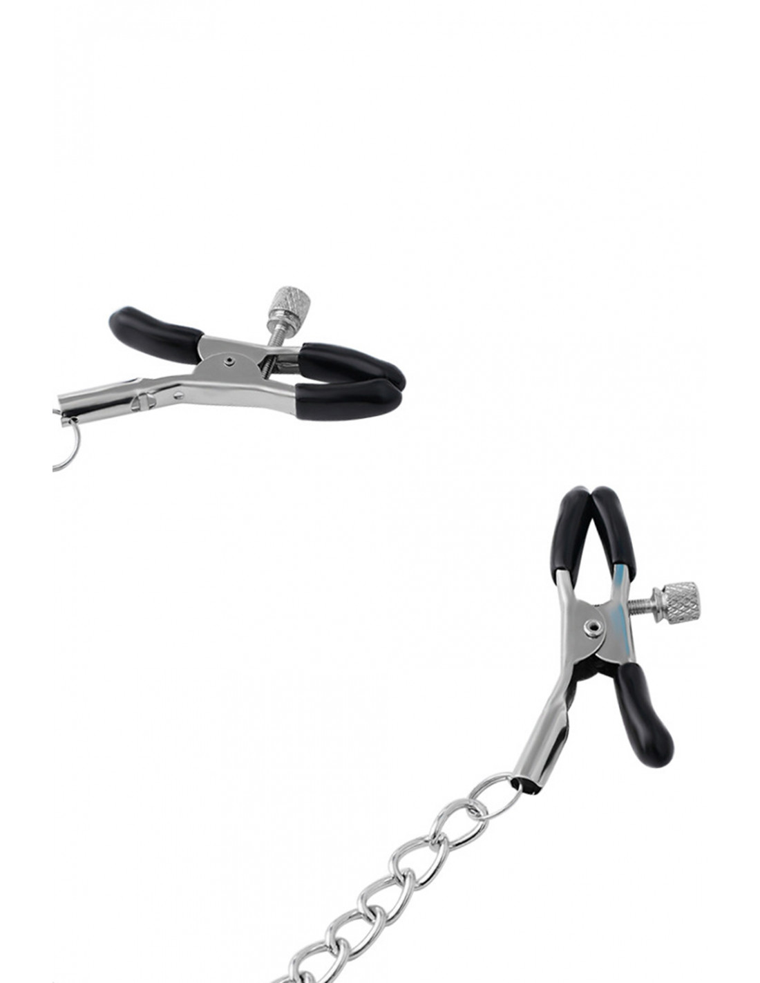 Deze verstelbare klassieke tepelklemmen zijn ideaal om elke sub mee te prikkelen. Ze zijn makkelijk op te schroeven voor meer of minder intense prikkels. De klemmen zijn via een ketting verbonden aan een decoratieve "Bitch" hanger