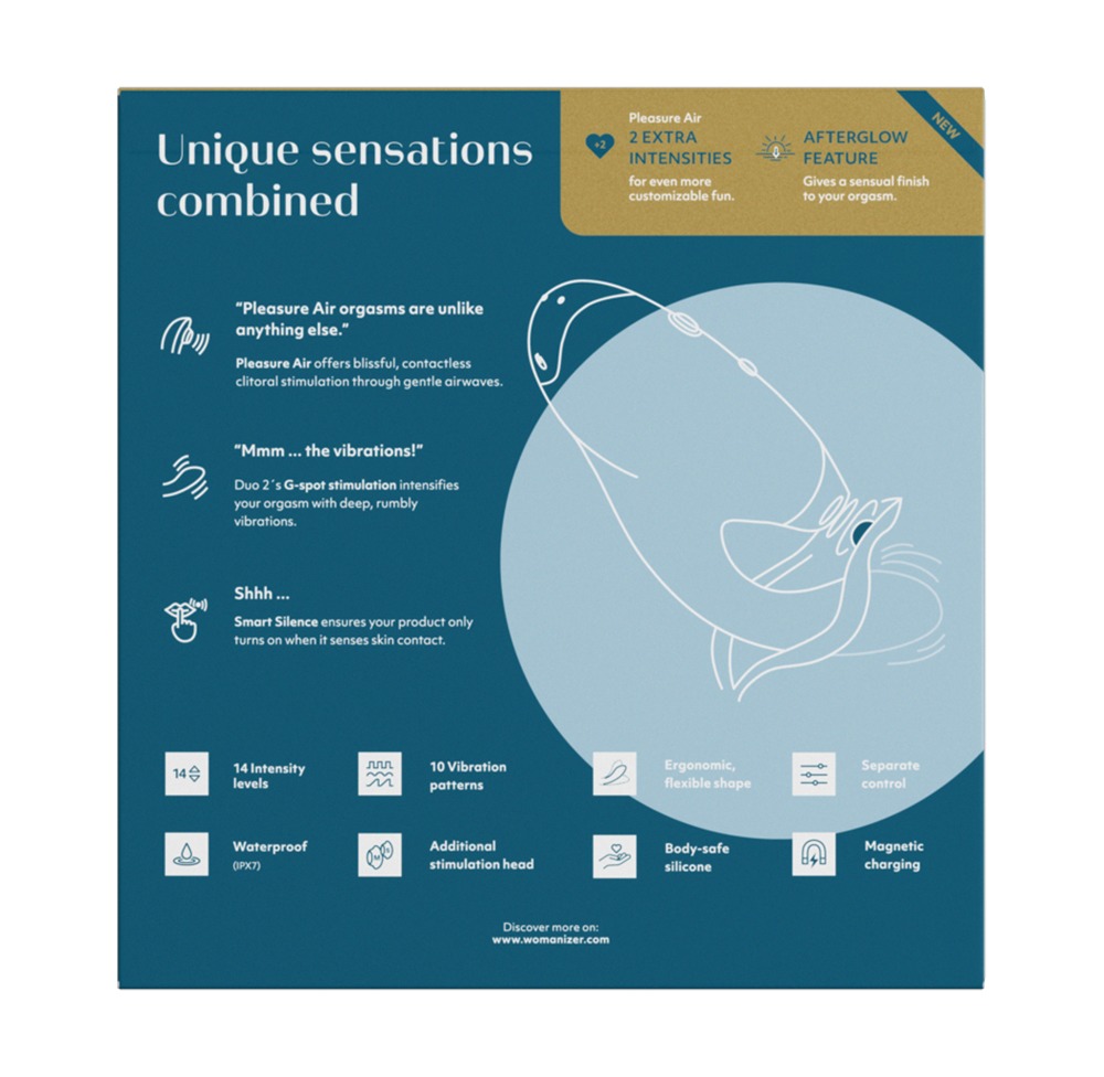 De revolutionaire Womanizer Pleasure Air™ Technology gecombineerd met krachtige G-spot stimulatie – dat is de DUO 2 van Womanizer. Het klassieke Womanizer clitorisopzetstuk bevredigt de vrouwelijke clitoris terwijl de vibrerende arm, die zich perfect aanpast aan de vrouwelijke contouren, de G-spot op een heerlijke manier stimuleert.