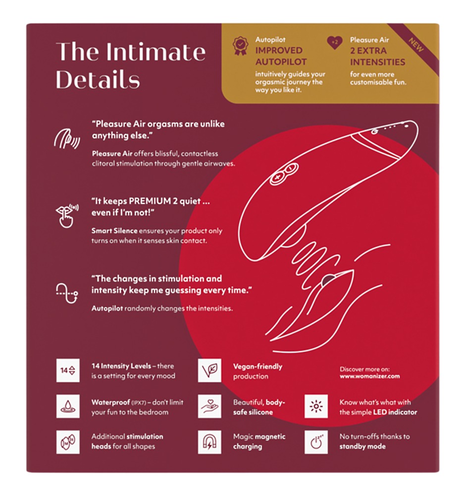 - Verbeterde Autopilot-functie: De Autopilot-functie neemt jou mee op avontuur. De Womanizer Premium 2 is met behulp van feedback van 1600 testers nog beter geworden in zijn Autopilot-functie. Hij biedt nu meer intensiteitsniveaus dan ooit om tot een prikkelend orgasme te komen. In deze autopilot-functie schakelt de Womanizer zelf tussen de verschillende standen. Jij hoeft alleen maar te genieten.