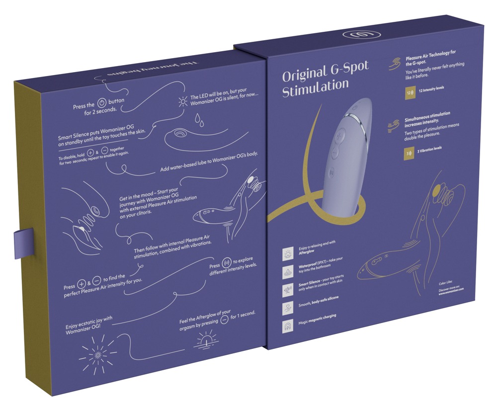 De gepatenteerde Pleasure Air Technology met pulserende golven en een zacht zuigeffect in 12 sterktes is eenvoudig te bedienen met een knop (+/-). Bovendien kunnen ook 3 verschillende vibratiestanden (zacht, medium, intens) worden aangepast via een knop. Dankzij de Smart Silence-functie gaat de Womanizer OG alleen aan als er huidcontact is.  Voor een ontspannend en wegstervend orgasme kan de OG direct op het laagste niveau (Afterglow) worden gezet. Het waterdichte ontwerp maakt het bruikbaar in bad en onder de douche.