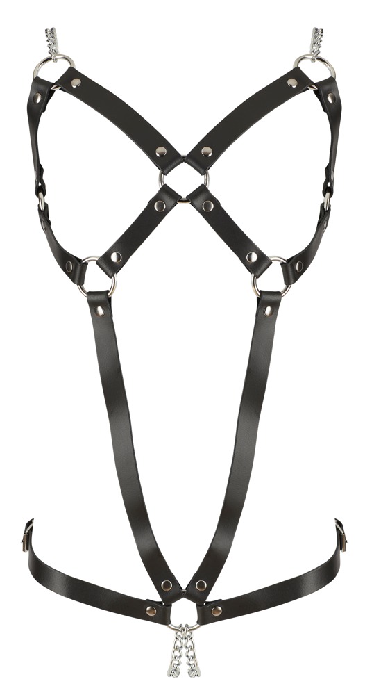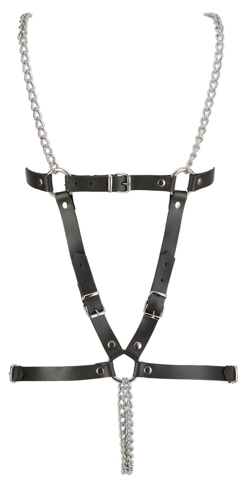 Gemaakt van zwart leer met metalen ringen en kettingen voor een krachtige dominatrix-look.